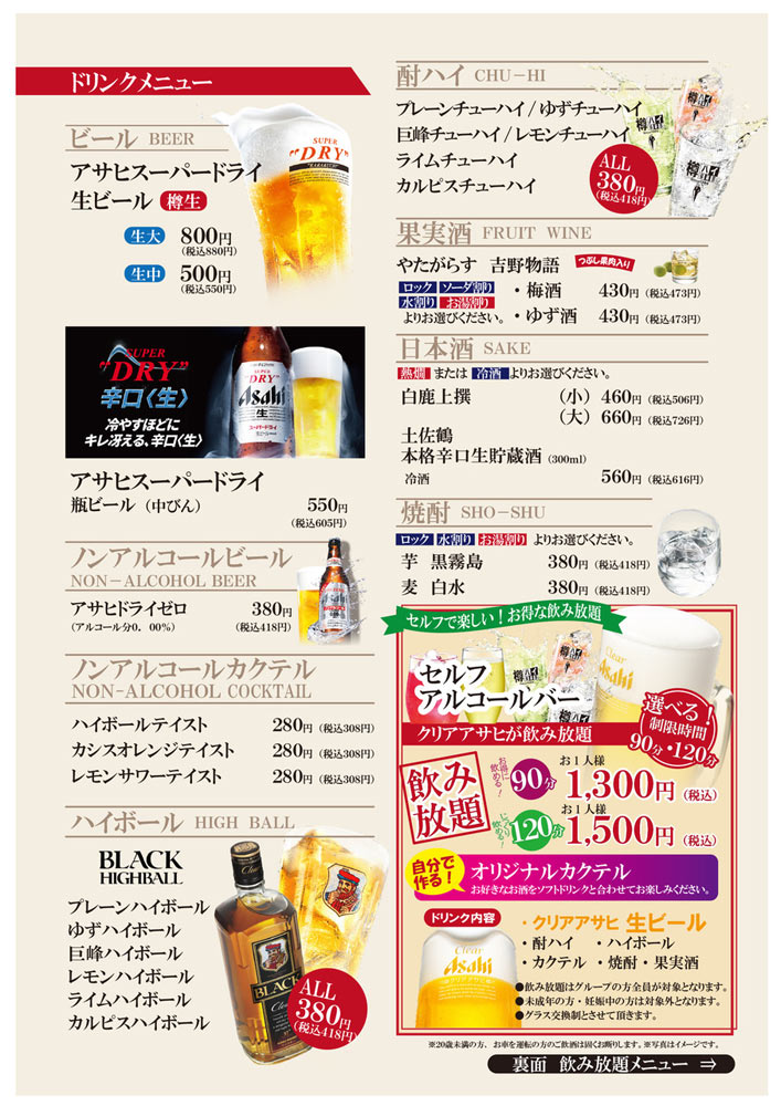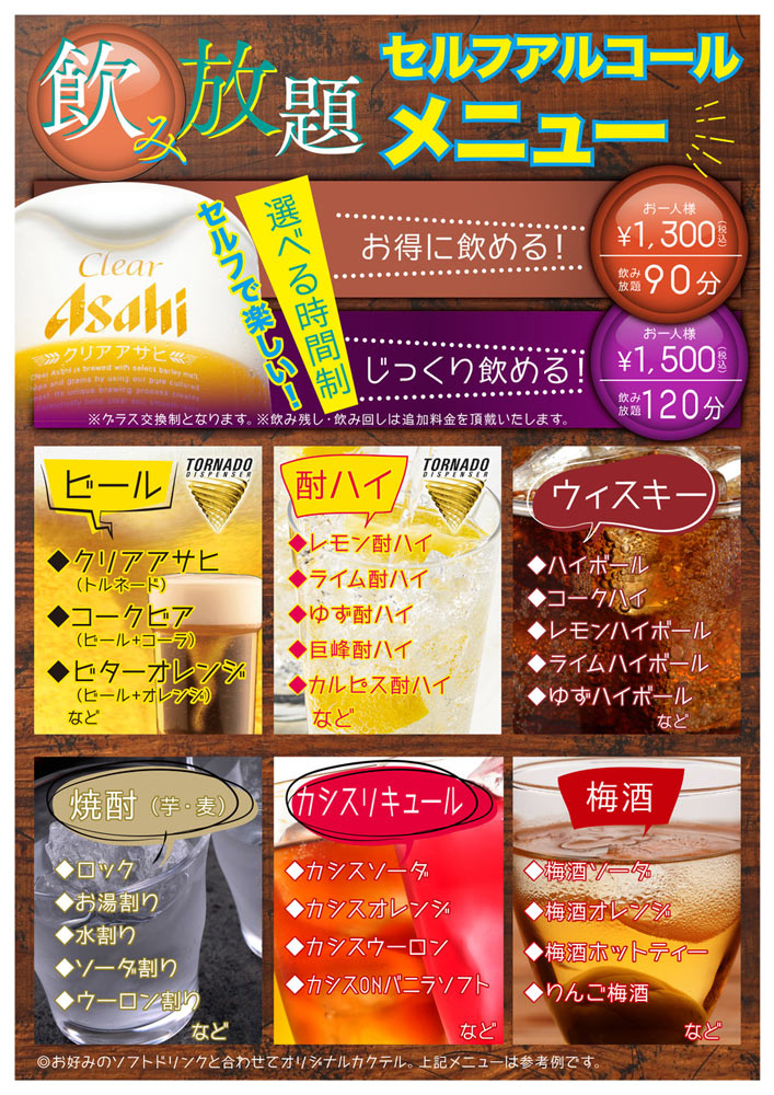セルフ飲み放題 120分(お一人様) +1,500円(税込)